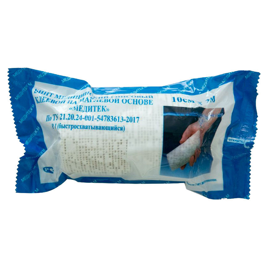 Бинт медицинский гипсовый клеевой на марлевой основе «МЕДИТЕК» предназначен для наложения внешних шин при переломах, травмах мягких тканей, иммобилизации при лечении болезней суставов и других случаях при необходимости использования фиксирующих повязок.Бинт гипсовый пропускает рентгеновские лучи.