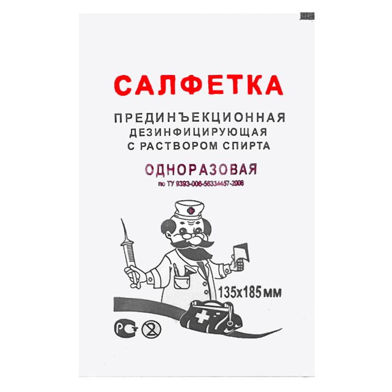 Салфетка прединъекционная дезинфицирующая с раствором спирта, одноразовая предназначена для дезинфекции кожи при инъекциях. Салфетки могут быть использованы при оказании первой помощи, в поликлинических и стационарных условиях, в полевых условиях и быту. Салфетка представляет собой основу из нетканого текстилеподобного материала, пропитанную 70% спиртовым раствором, индивидуально упакованную в пакеты из 3-х слойного комбинированного материала.