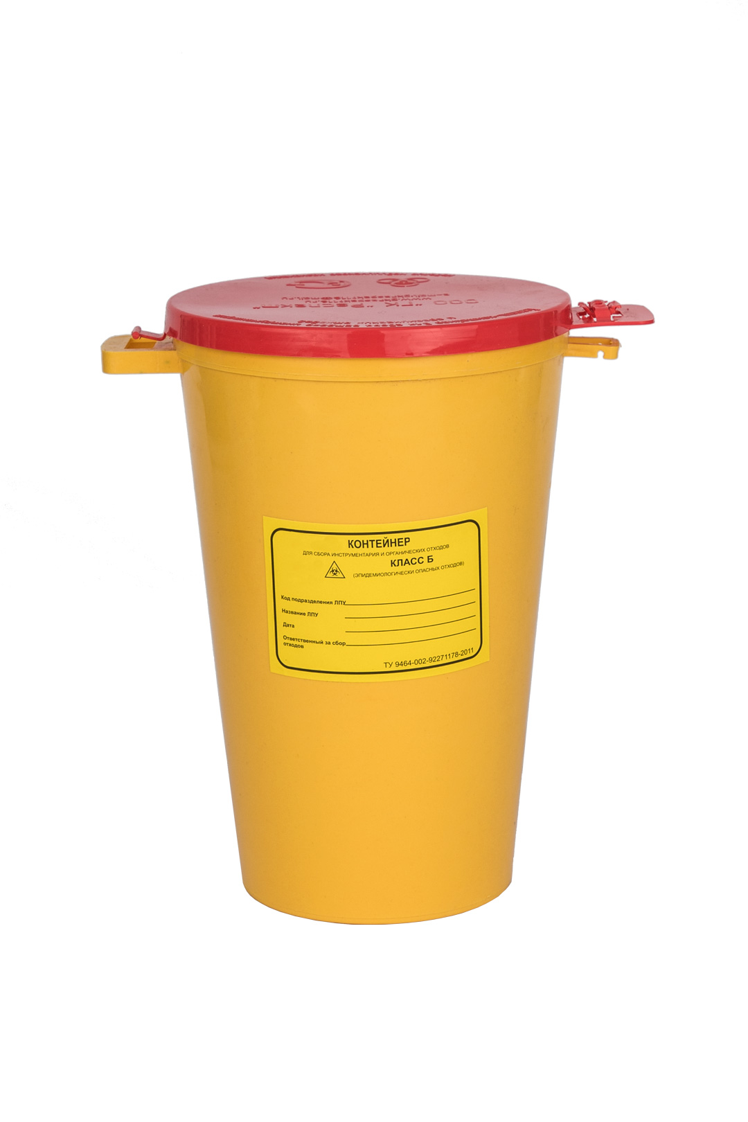 Корпус ёмкости может быть выполнен из желтой (для отходов класса Б) или красной пластмассы (для отходов класса В). В некоторых случаях производители могут выпускать корпуса только из желтого пластика, комплектуя контейнеры наклейками разного цвета и с соответствующим указанием класса опасности медицинских отходов. На самой этикетке медперсонал может указывать дополнительную информацию об отходах - например, код и название ЛПУ, дату начала сбора и ответственного за сбор отходов.